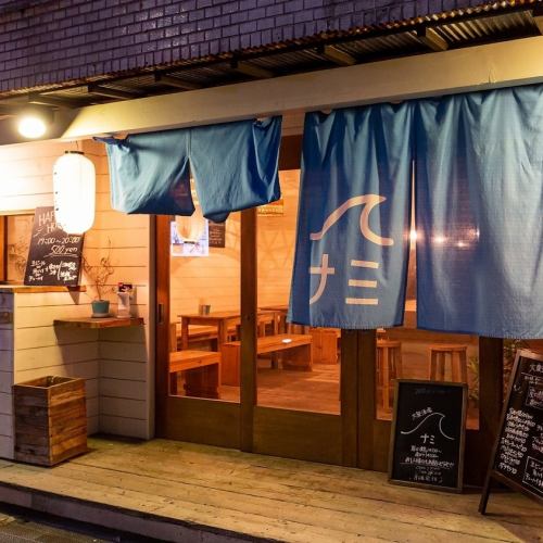 大きな入口は風通しと解放感が◎ロゴマークの入った青い暖簾が目印です!全体に木を使用した温もり溢れるお店♪